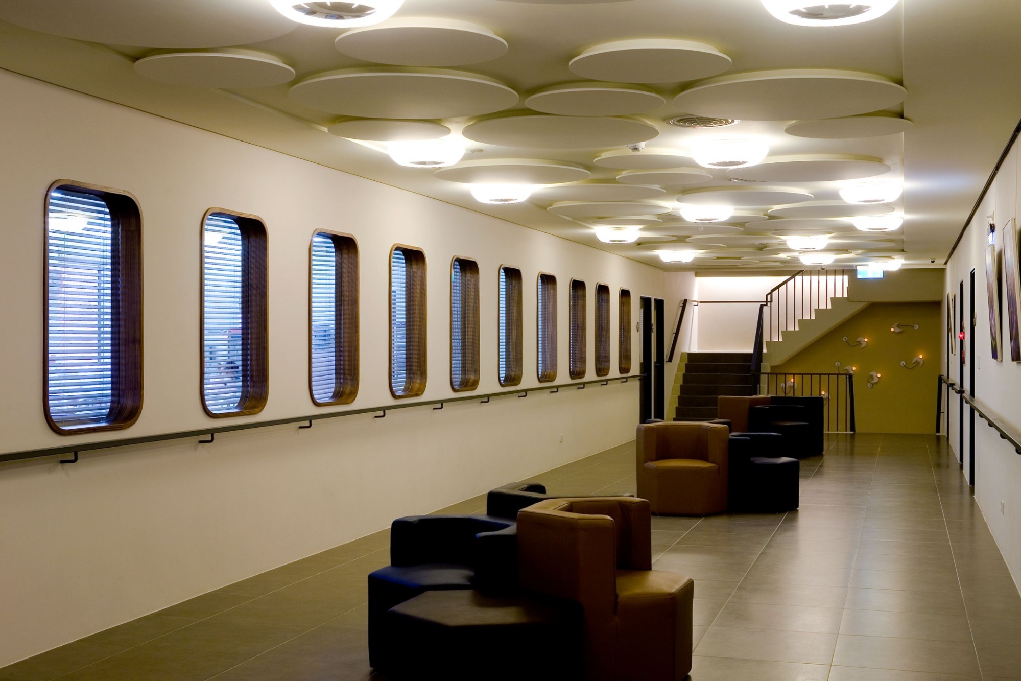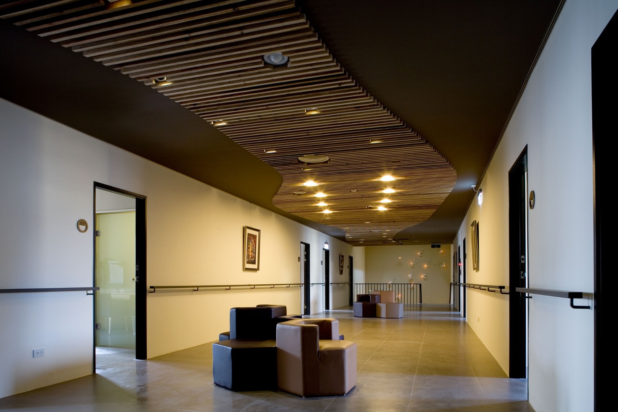 各層樓空間以廊道為中心舞台,融合各種素材主題設定,造型色彩層次豐富,運用多元的空間語彙在各個區域裡建構出生動且舒適的休憩空間。棕灰色耐磨地坪,與點點星綴的燈源、富有律動感的木條造型天花板以及幾何沙發組合出高低大小不一的大小區塊,堆疊出走道的豐富性。在沉穩基調之下的趣味裝置為空間添增活力,好似小生命跳躍的脈搏律動著,令人體驗空間的豐富性之際,一同感受迎接寶寶誕生的歡愉喜悅。