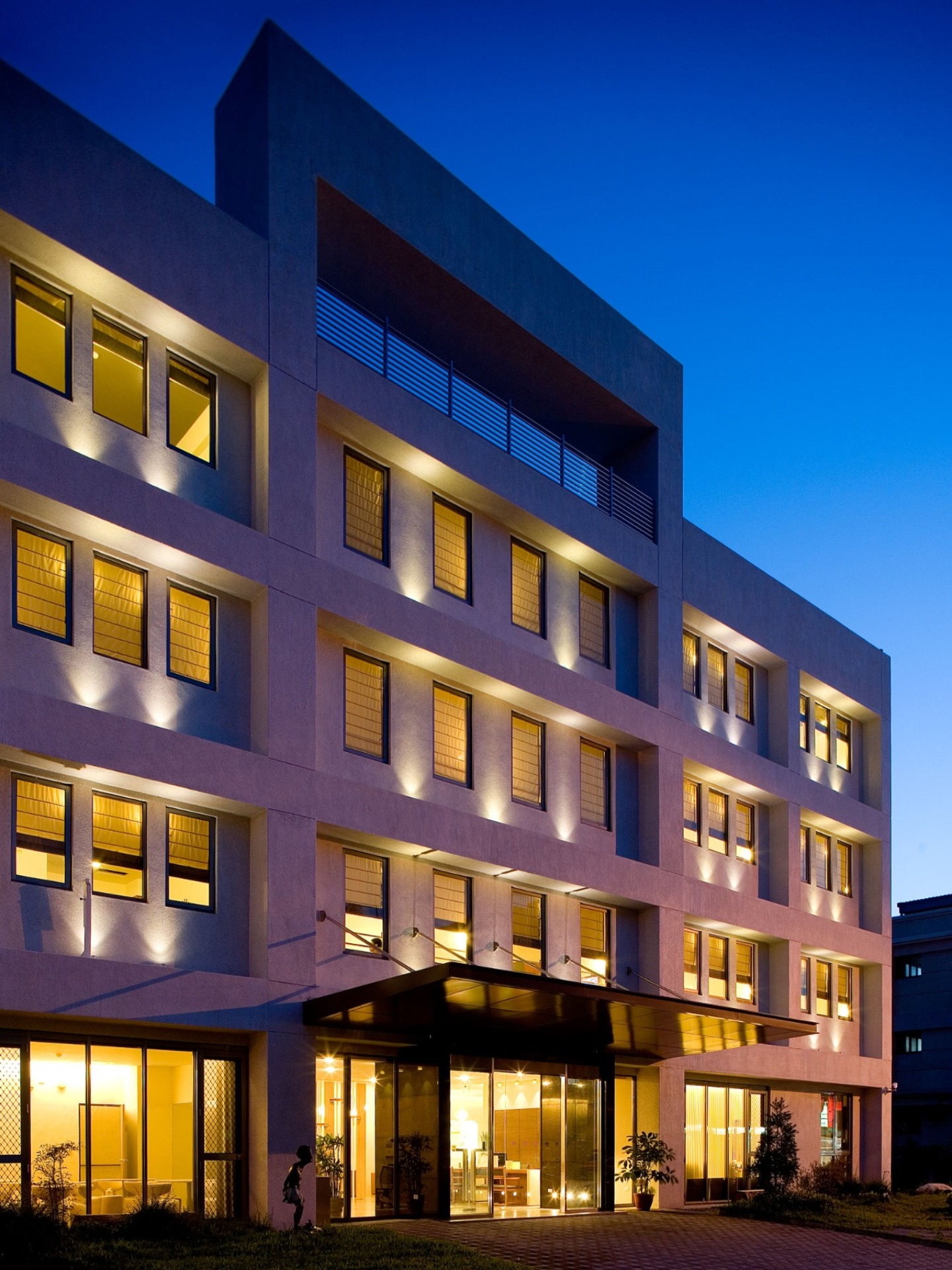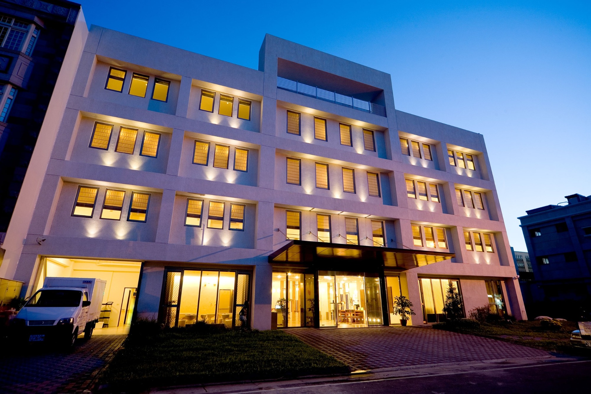 考慮到產婦需要較長時間住宿,在建築外觀上捨棄花俏繁複的裝飾,以樸拙的抿石子為主要建材,賦予簡約內斂的整體調性。由於產婦不宜吹風,特意在方整的建地上設計出ㄇ字型的結構,清玻璃的立面援引了充足採光,加上不鏽鋼樓梯形成線條漂亮的結構體,構成適宜靜養的幽靜環境,讓產婦可以在長廊散步欣賞中庭花園景觀。
