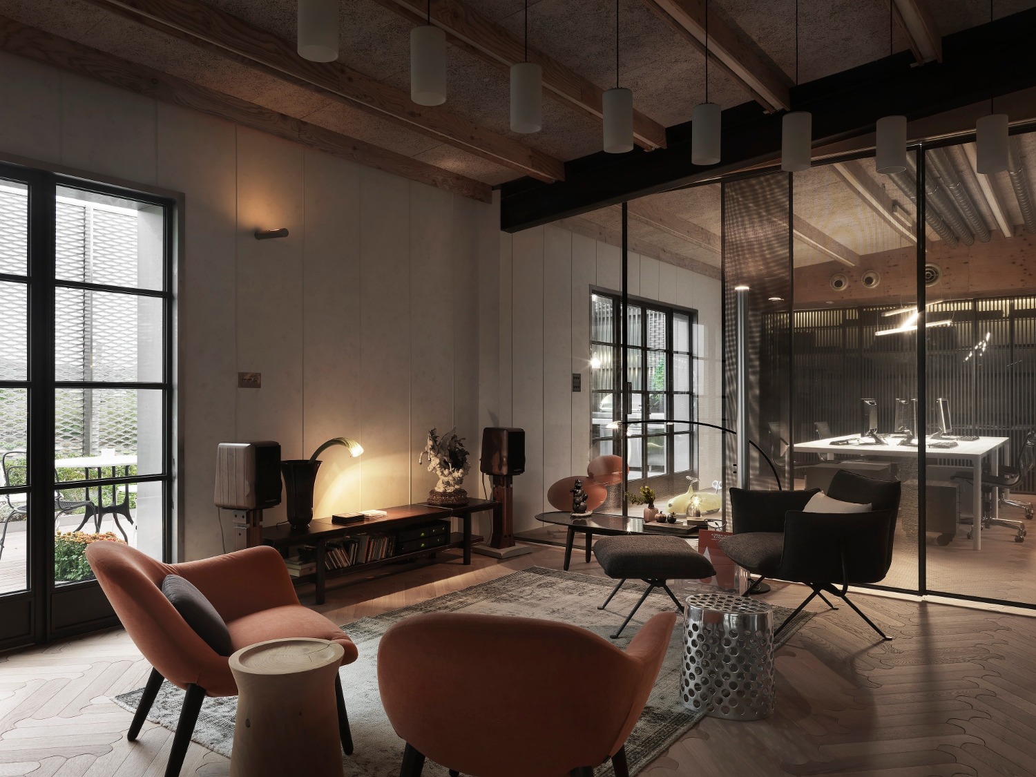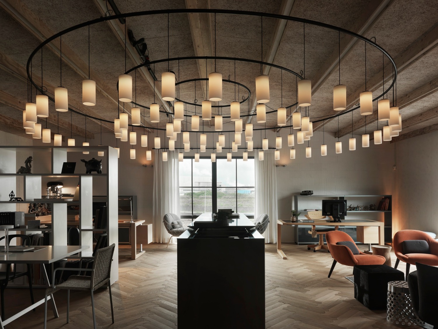 設置大量的冷軌鋼門窗,纖細框架讓窗外景色一覽無遺,讓天空與大地美景延伸與融合室內空間。層層圍塑的自然氛圍,營造人、生活、環境之間的共生融合,也摒除辦公室給人封閉的印象。