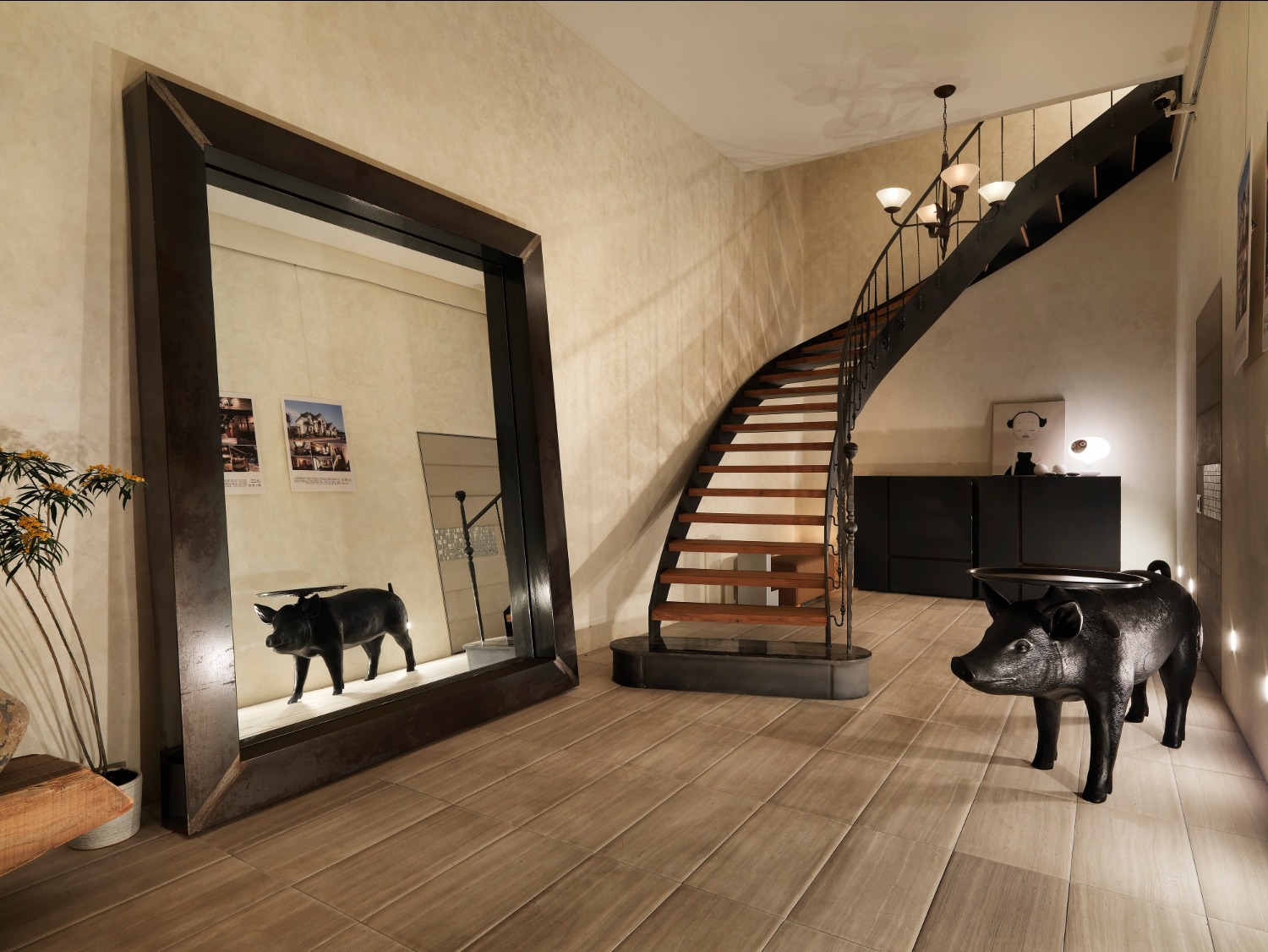 窄長型玄關以多層手作塗料構築出自然沉靜氛圍,陳列出義大利藝術鏡、燈飾、原木長凳、以及歷年作品寫真等,這些藝品在樸質空間更能突顯之美學價值。