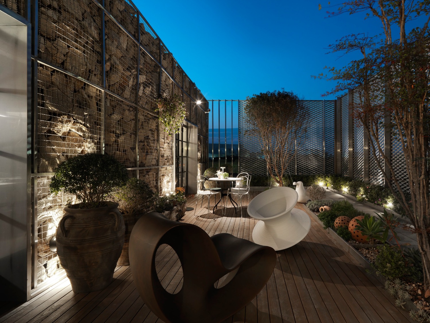 為貼近室內外風格一致,將延伸露台孕育出濃厚的鄉村自然風格,堆砌石牆、溫潤木地板、茂盛的綠稙花草為露台散發出舒適休閒的氛圍,宛如時尚雜誌最愛取景的露台之一。小型Bar台的設置,讓露台的功能性更多元,在工作之餘能進行野餐、BBQ等休閒活動。