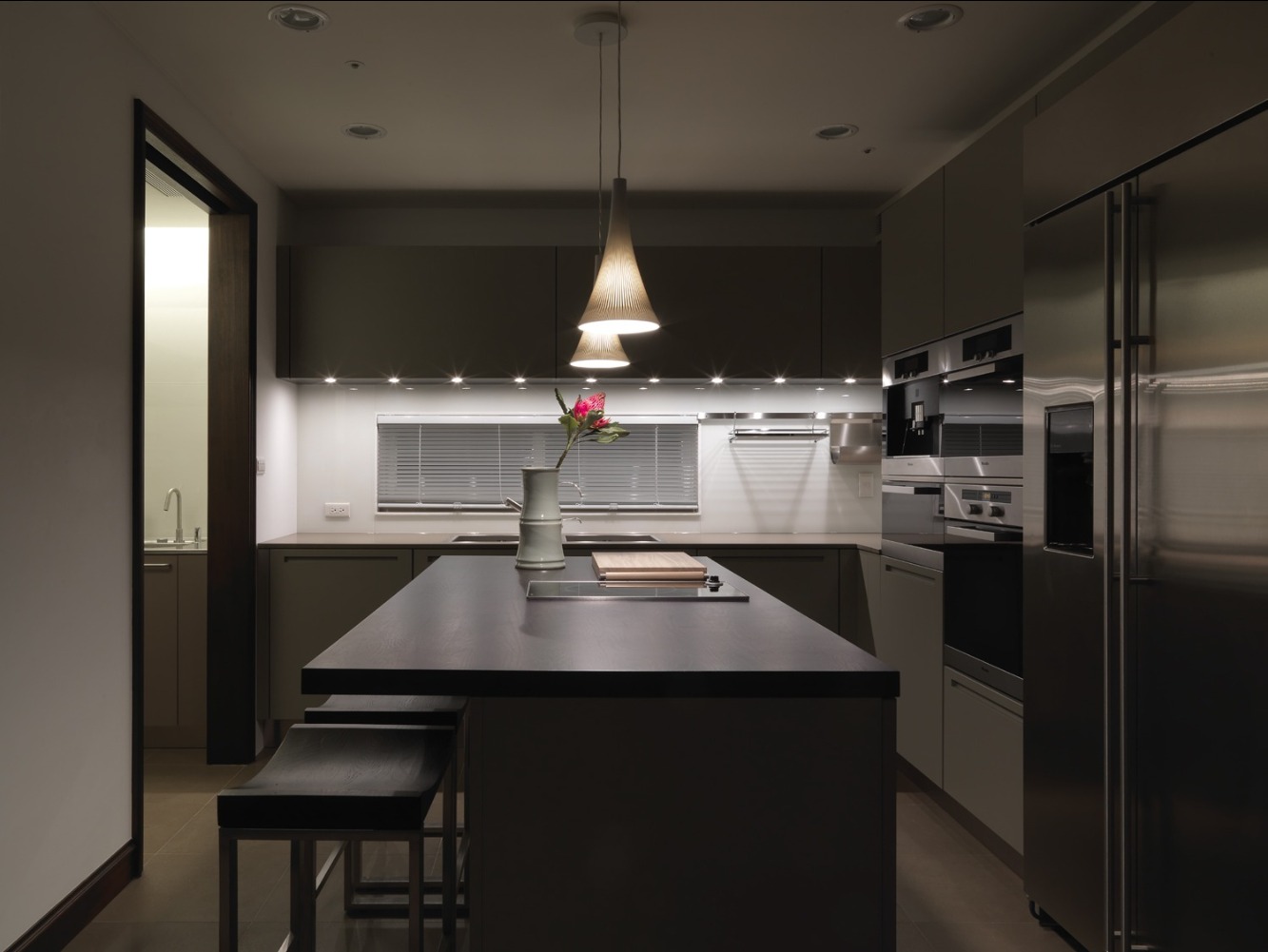 廚房與中島檯面強調簡約線條,沒有多餘綴飾進而營造整潔有序的質感,中島上方吊燈則增空間層次感。